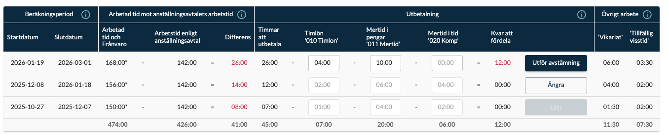I Timeplan hanteras detta med beräkningsperioder, nya passtyper och en periodavstämning som automatiskt beräknar eventuell mertid.