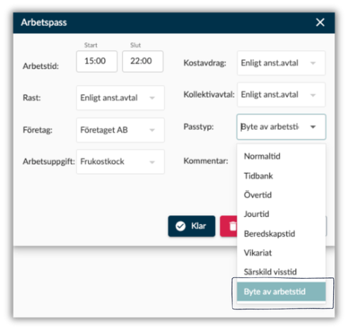 Lägg en kommentar på passet med vilken dag som bytts bort. Du kan även lägga en "Egen kommentar" på den dag som blev ledig, för spårbarhet.